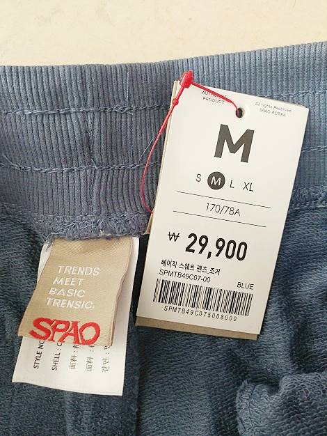 태그를 살펴보면, 정식 명칭은 스파오 "베이직 스웨트 팬츠 조거(SPMTB49C07)"이고, 같은 SPAO에서 비슷한 종류의 제품 라인이 여러 개 나오는데 그 중에 제일 저렴하게 재고 방출(?)하는 모델을 하나 골랐네요.